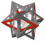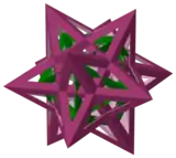 Triacontaedro convexo y mediano triacontaedro rómbico (ambos mostrados con simetría tetraédrica); y a la derecha el politopo compuesto de los sólidos de Kepler-Poinsot |