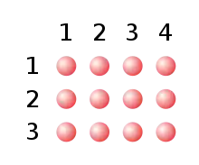 Multiplicar una cantidad por un número consiste en sumar dicha cantidad tantas veces como indica el número.[3] Así, 4×3 (léase «cuatro multiplicado por tres» o, simplemente, «cuatro por tres») es igual a sumar tres veces el número 4 (4+4+4)[4](nota[5]) También se puede interpretar como 3 filas de 4 objetos, o 4 filas de 3 (véase el dibujo). 4 y 3 son los factores, y 12, el resultado de la operación, es el producto.[6] La multiplicación está asociada al concepto de área geométrica: es fácil ver que el área de un rectángulo se obtiene multiplicando la longitud de ambos lados, basta con imaginarnos la superficie cubierta con baldosas cuadradas.[7] Podemos multiplicar dos números o más, y da igual en qué orden efectuemos la operación o cómo agrupemos los números; siempre se obtendrá el mismo resultado: