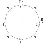 • Una multiplicación por corresponde a una rotación de 90 grados en el sentido "positivo" (en el sentido antihorario), y el cuadrado de la ecuación puede interpretarse como efectuar dos rotaciones de 90 grados sobre el origen, equivalente a una rotación de 180 grados, .