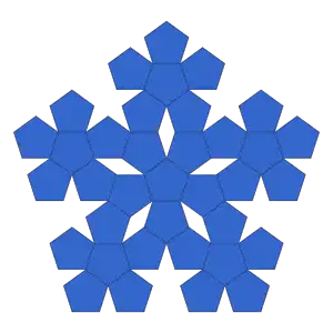Un pentaflake, o pentágono de Sierpinski, está formado por sucesivos flakes de seis pentágonos regulares. [2] Cada flake se forma colocando un pentágono en cada esquina y uno en el centro. Su dimensión Hausdorff es igual a ≈ 1.8617, donde (proporción áurea). El se obtiene porque cada iteración tiene 6 pentágonos escalados por . El límite de un pentaflake es la curva de Koch de 72 grados.