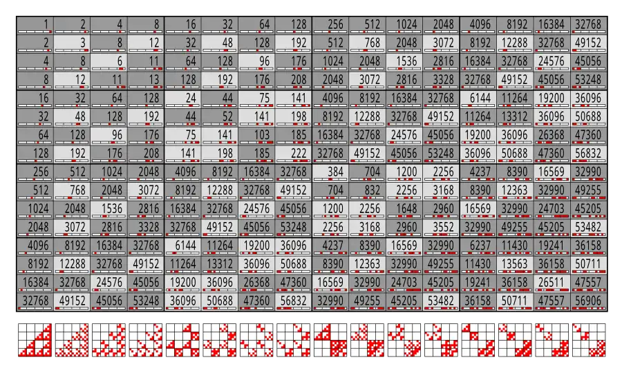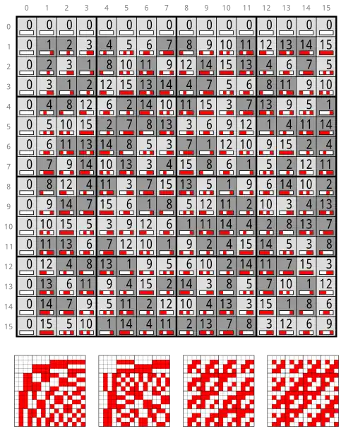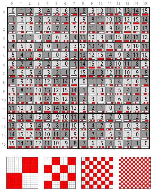 Esta es también la tabla de Cayley de Z24 – o la tabla de operaciones XOR bit a bit .Las matrices pequeñas muestran los dígitos únicos de los números binarios.