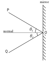 Se denomina rayo normal al que apunta perpendicularmente hacia afuera de la superficie de un medio óptico en un punto dado.[4] En el estudio de la reflexión de la luz, ángulo de incidencia y ángulo de reflexión son respectivamente el ángulo entre la normal y el rayo incidente (en el plano de incidencia) y el ángulo entre la normal y el rayo reflejado.