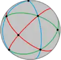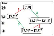 . Los generadores de reflexión, a partir de una construcción D3=A3, son las matrices R0, R1, R2. R02=R12=R22=(R0×R1)3=(R1×R2)3=(R0×R2)2=Identidad. [3,3]+ (![]()