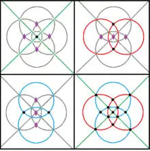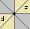 , un espejo, generalmente el último, se traslada fuera del origen. Un generador traslación t0,1 (y una matriz T0,1) se construyen como el producto de dos (o un número par de) reflejos, incluido el reflejo afín. Un reflexión deslizada (reflexión más traslación) puede ser el producto de un número impar de reflexiones f0,1,2 (y matriz V0,1,2), como el subgrupo de índice 4 ![]()