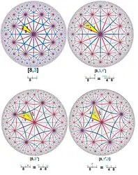 para el grupo triangular (p q r). Si los órdenes de ramificación son iguales, se pueden agrupar como un exponente según la duración del ciclo entre paréntesis, como [(3,3,3,3)] = [3[4]], que representa el diagrama de Coxeter ![]()