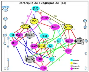 . Las matrices generadoras de reflexión son R0, R1, R2. R02=R12=R22=(R0×R1)5=(R1×R2)3=(R0×R2)2=Identidad. [5,3]+ (![]()