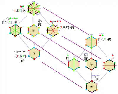 ) se genera mediante la reflexión R0 y la rotación S1,2. Una rotorreflexión de orden 6 es generada por V0,1,2, el producto de las 3 reflexiones.