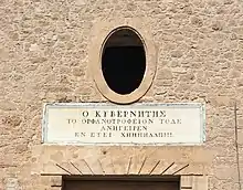 Plaza sobre el portal de un orfanato luego convertido en prisión en Egina. La inscripción antigua reza “El gobernados levantó este orfanato en el año 1828”. El año aparece como Χ𐅅ΗΗΗΔΔΠΙΙΙ.