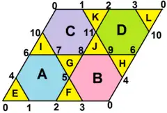 ![]() El desarrollo de caras se puede organizar como un rombo dividido en 8 triángulos y 4 hexágonos. Todos los vértices tienen defecto angular cero. |