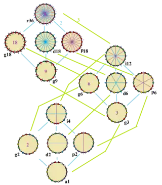 John Conway clasificó estas simetrías usando una letra y el orden de la simetría a continuación. Asignó la letra r al grupo de simetría de la figura regular; y en el caso de los subgrupos utilizó la letra d (de diagonal) para las figuras con ejes de simetría solo a través de sus vértices; p para figuras con ejes de simetría solo a través de ejes perpendiculares a sus lados; i para figuras con ejes de simetría tanto a través de vértices como a través de centros de lados; y g para aquellas figuras solo con simetría rotacional. Con a1 se etiquetan aquellas figuras con ausencia de simetría. Los tipos de simetrías más bajos permiten disponer de uno o más grados de libertad para definir distintas figuras irregulares.[2] Solo el subgrupo g18 no tiene grados de libertad, pero puede verse como un grafo dirigido. (Véase un ejemplo en la Teoría de grupos de John Conway)
