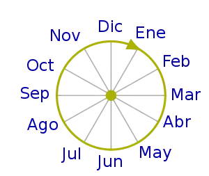 En matemáticas, un orden cíclico es una forma de organizar un conjunto de objetos dispuestos sobre una circunferencia.[1] A diferencia de la mayoría de las estructuras en teoría del orden, un orden cíclico no se modela como una relación binaria habitual del tipo "a < b". Por ejemplo, no se dice que el norte esté situado "más en el sentido de las agujas del reloj" que el sur. En cambio, un orden cíclico se define como una relación ternaria [a, b, c], lo que significa que "después de a, se llega a b antes de pasar por c". Por ejemplo, de acuerdo con la imagen de la derecha, la terna de meses del año [junio, octubre, febrero] responde a esta definición, pero en cambio la terna formada por [junio, febrero, octubre] no lo hace. Una relación ternaria se denomina orden cíclico si es cíclica, asimétrica, transitiva y conectada. Descartar el requisito de "conectada" da como resultado un orden cíclico parcial.[2]