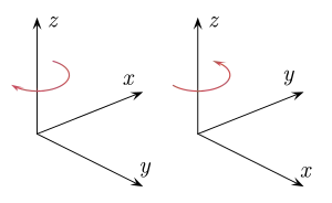 De manera similar, sea A una aplicación lineal no singular del espacio vectorial Rn sobre Rn. Esta aplicación se dice que conserva la orientación si su determinante es positivo.[2] Por ejemplo, en R3 una rotación alrededor del eje cartesiano Z en un ángulo α conserva la orientación: