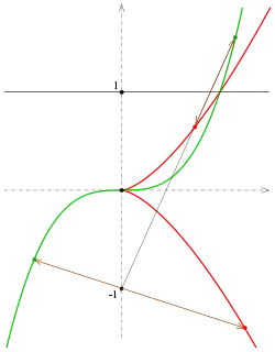 Hacer corresponder la parábola semicúbica mediante homografía (perspectividad involutiva con eje y centro ) produce , de ahí la función cúbica La cúspide (origen) de la parábola semicúbica se intercambia con el punto en el infinito del eje y.