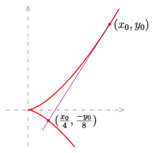 Derivando la parábola unitaria semicúbica se obtiene en el punto de la rama superior la ecuación de la tangente: