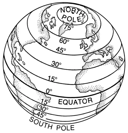 El ángulo formado (con vértice en el centro de la Tierra) sobre cualquier plano meridiano por un paralelo y la línea ecuatorial se denomina latitud y es la misma para todos los puntos del paralelo,[4] la cual se discrimina entre latitud Norte y latitud Sur según el hemisferio.