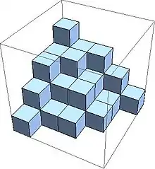 Sustituyendo cada nodo de una partición plana por un cubo con bordes alineados con los ejes se obtiene una representación pila de cubos de la partición plana.