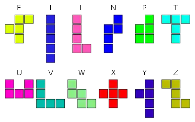 Un rompecabezas 2D de pentominós consiste en rellenar un rectángulo con los 12 pentominós distintos sin dejar huecos vacíos ni superponiendo cuadrados. Cada uno de los 12 pentominós ocupa un área de 5 cuadros, por lo que el rectángulo deberá tener una superficie de 60 cuadrados. Las posibles dimensiones son 6×10, 5×12, 4×15 y 3×20. Un jugador hábil no tarda mucho en encontrar una solución válida. Una tarea más larga sería contar cuántas posibles soluciones existen para cada caso, lo que requiere el uso de algoritmos de búsqueda por computador.