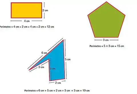 El perímetro de un polígono se puede calcular sumando las longitudes de todos sus lados. Así pues, la fórmula para los triángulos es P = a + b + c, donde , y son las longitudes de cada lado. Para los cuadriláteros, la ecuación es P = a + b + c + d. Más en general, para un polígono de lados: