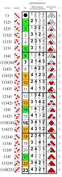 De izquierda a derecha aparecen las permutaciones en forma matricial, en forma de vector y como producto de transposiciones. Los números a la derecha indican la cantidad de transposiciones con que se puede escribir cada permutación (este número no es único, pero sí su paridad). Las permutaciones impares están marcadas con verde o naranja.