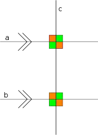Como se ve en la figura, si dos líneas (a y b) son perpendiculares a una tercera línea (c), todos los ángulos formados en la tercera línea son ángulos rectos. Por lo tanto, en Geometría euclidiana, cualquier par de líneas que son perpendiculares a una tercera línea son paralelas entre sí, debido al quinto postulado de Euclides. Por el contrario, si una línea es perpendicular a una segunda línea, también es perpendicular a cualquier línea paralela a la segunda línea.
