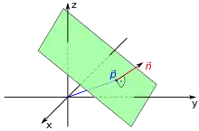 Donde (A, B, C) es un vector perpendicular al plano y coincide con el producto vectorial de los vectores u y v. La fórmula para hallar la ecuación cuando no está en el origen es: