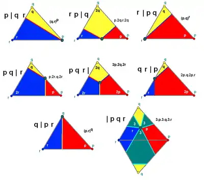 ![]() Los poliedros regulares (p | 2 q) y quasirregulares (2 | p q) se crean a partir de una construcción de Wythoff con el punto generador en una de las 3 esquinas del dominio fundamental. Esto define una sola arista dentro del dominio fundamental. |