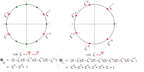 - , el polinomio ciclotómico es de coeficientes enteros, es decir, .