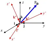 Cuando el movimiento de la partícula se describe a un sistema de referencia móvil (x,y,z) en rotación con respecto de un referencial fijo (X,Y,Z) con el que comparte el mismo origen, el vector de posición será el mismo en ambos referenciales y vendrá expresado por: