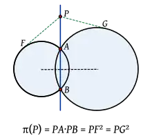 El caso más sencillo, aquí ilustrado, es el que ambas circunferencias se cortan. Denominando por A, B a los puntos de corte, se observa que para cualquier punto de la línea AB se cumple que la potencia respecto a cualquiera de las dos circunferencias es la misma: PA·PB.