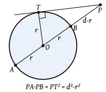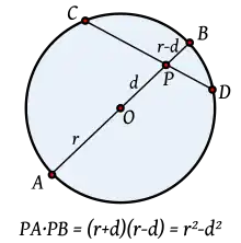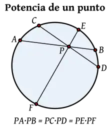 De forma más precisa, si P es un punto en el plano y se fija una circunferencia con centro O, entonces para cualquier recta que pase por P y corte a la circunferencia en dos puntos A, B, se cumple que PA·PB es constante, independientemente de la posición de la recta. El valor de dicha constante se denomina la potencia del punto P.