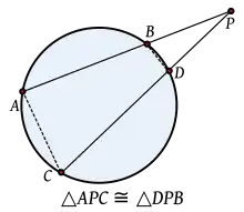 Tomando dos cuerdas arbitrarias AB y CD de la circunferencia que se cortan en el punto P, se consideran los triángulos y los cuales serán semejantes, pues :