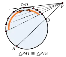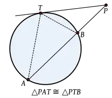 Este caso en realidad puede considerarse como un caso límite del correspondiente a dos secantes, obtenido cuando los puntos C, D se desplazan sobre la circunferencia hasta coincidir. En este sentido, el punto de tangencia es en realidad un punto de corte «doble» y el producto PC·PD se convierte en PT·PT=PT².