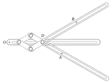 De acuerdo con Roberto Marcolongo (1862-1943),[14][15] Leonardo da Vinci, al final del siglo XV, buscó en vano una solución matemática al problema de Alhacén antes de proponer una solución mecánica, utilizando un instrumento articulado, un pantógrafo diseñado para garantizar la igualdad de los ángulos AOD y ODB. Al analizar textos y dibujos de algunos cuadernos del Codex Atlanticus, Marcolongo construyó el instrumento articulado en el lado opuesto. El punto O se coloca en el centro del círculo, la longitud OD es fija, e igual al radio del círculo. Las ramas (DA) y (DB) giran alrededor de D manteniendo (OD) como bisectriz, porque el diamante formado por el sistema articulado se deforma mientras se mantiene el vértice opuesto a "D" alineado con O y D. Colocando un alfiler en A en el sistema deslizante de la rama (DA), se hace girar el instrumento alrededor de O para que la segunda rama pase por B.