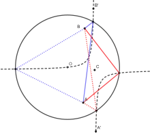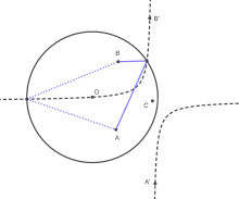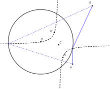 Estas diversas curvas cortan ls circunferencia en dos o en cuatro puntos. Cuando A y B están dentro del círculo, todos estos puntos son soluciones. Si son externos, solo uno de dos puntos es la solución buscada.[18]