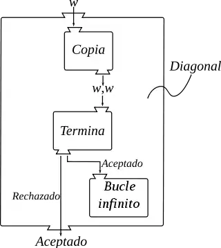 Es posible crear una máquina Copia que al recibir una cadena cualquiera termine en un estado de aceptación con en su cinta. Ahora crearemos una máquina Diagonal que recibe de entrada una cadena , que presuntamente será la codificación de una máquina de Turing . Primero Diagonal utilizará la máquina Copia para duplicar la cadena , convirtiéndola en . A continuación, Diagonal pasará este resultado a través de Termina para decidir si la máquina representada por para ante la cadena y realiza lo opuesto: Si Termina acepta, entonces Diagonal entra en un bucle infinito (que consiste de un solo estado al que se regresa una y otra vez) y en otro caso, si Termina rechaza entonces Diagonal termina en estado de aceptación.