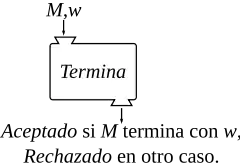 Supongamos que el problema de la parada tiene solución. Es decir, supongamos que existe una máquina de Turing que es capaz de determinar si otra máquina de Turing parará (terminará) con una entrada determinada. Llamemos Termina a esta máquina. Esta máquina recibiría como entrada la cadena , donde es la codificación de una máquina de Turing y es la codificación de la cadena que se le alimenta a . La máquina terminará en un estado de aceptación si para ante la entrada , y en otro caso terminará en un estado de rechazo, pero nunca entrará en un ciclo infinito.