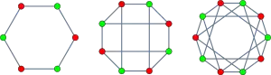 Las soluciones al problema del menaje pueden interpretarse en términos de la teoría de grafos, como grafos de corona con ciclos hamiltonianos dirigidos. Un grafo de corona se forma eliminando un emparejamiento perfecto de un grafo bipartito completo Kn,n; tiene 2n vértices de dos colores, y cada vértice de un color está conectado a todos menos uno de los vértices del otro color. En el caso del problema del menaje, los vértices del grafo representan hombres y mujeres, y las aristas representan parejas de hombres y mujeres que pueden sentarse uno al lado del otro. Este grafo se forma eliminando la combinación perfecta formada por las parejas hombre-mujer de un grafo bipartito completo que conecta a cada hombre con cada mujer. Cualquier disposición de asientos válida puede describirse mediante la secuencia de personas en orden alrededor de la mesa, que forma un ciclo hamiltoniano en el grafo. Sin embargo, dos ciclos hamiltonianos se consideran equivalentes si conectan los mismos vértices en el mismo orden cíclico independientemente del vértice inicial, mientras que en el problema del menaje la posición inicial se considera significativa: si, como en la fiesta del té de Alicia en el país de las maravillas, todos los invitados cambian sus posiciones en un asiento, se considera una disposición de asientos diferente aunque esté descrita por el mismo ciclo. Por lo tanto, el número de ciclos hamiltonianos orientados en un grafo de corona es menor por un factor de 2n que el número de disposiciones de asientos,[6] pero mayor por un factor de (n − 1)! que los números de menaje. La secuencia de números de ciclos en estos grafos (como antes, comenzando en n = 3) es