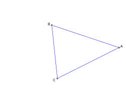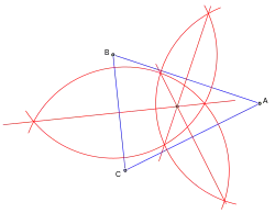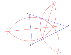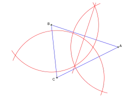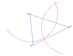 El problema matemático asociado podría ser denotado como , donde es el conjunto de todos los círculos posibles del plano euclídeo. El problema anterior se resuelve si se toma el segmento y se encuentra su recta mediatriz M1 y se toma el segmento y se encuentra su recta mediatriz M2