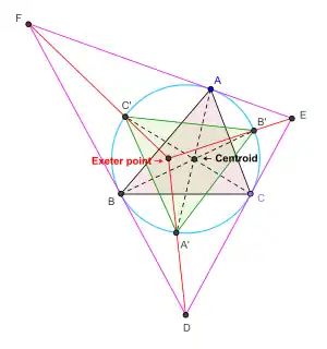 - Sea ABC un triángulo cualquiera dado. Trácense las medianas a través de los vértices A, B y C; conocida la circunferencia circunscrita del triángulo ABC, se obtienen sus intersecciones A', B' y C' con las medianas. Se construye el triángulo DEF, formado por las tangentes en A, B, y C a la circunferencia anterior (siendo D el vértice opuesto al lado formado por la tangente en el vértice A; E el vértice opuesto al lado formado por la tangente en el vértice B; y F el vértice opuesto al lado formado por la tangente en el vértice C). Las líneas a través de DA', EB' y FC' son concurrentes, y su punto de intersección es el punto de Exeter del triángulo ABC.