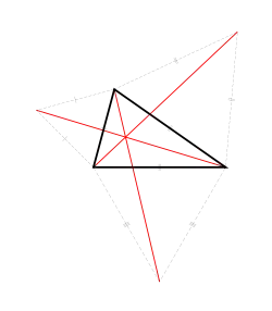 - Para cada nuevo vértice de los triángulos equiláteros, trazar una recta desde ahí hasta el vértice opuesto del triángulo dado.
