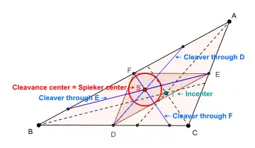 El centro de Spieker también se encuentra en la intersección de las tres cuchillas del triángulo ABC. Una cuchilla de un triángulo es un segmento de línea que biseca el perímetro del triángulo y tiene un punto final en el punto medio de uno de los tres lados. Cada cuchilla contiene el centro de masa del límite del triángulo ABC, por lo que las tres cuchillas se encuentran en el centro de Spieker.
