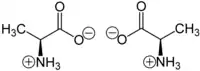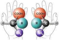 En química, la quiralidad generalmente se refiere a las moléculas. Dos imágenes especulares de una molécula quiral se denominan enantiómeros o isómeros ópticos. Los pares de enantiómeros se designan a menudo como "diestro", "zurdo" o, si no tienen sesgo, "aquiral". A medida que la luz polarizada pasa a través de una molécula quiral, el plano de polarización, cuando se ve a lo largo del eje hacia la fuente, se girará en el sentido de las agujas del reloj (hacia la derecha) o en el sentido contrario a las agujas del reloj (hacia la izquierda). Una rotación hacia la derecha es dextrorotaria (d); que a la izquierda es levorotaria (l). Los isómeros d y l son el mismo compuesto, pero se denominan enantiómeros. Una mezcla equimolar de los dos isómeros ópticos no producirá una rotación neta de la luz polarizada a medida que pasa.[9] Las moléculas zurdas tienen prefijo a sus nombres; d- es el prefijo de moléculas diestras.