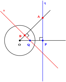 El polo de una recta L en una circunferencias C es un punto P que es el inversión en C del punto Q en L que es el más cercano al centro de la circunferencia. Recíprocamente, la recta polar (o polar) de un punto P en una circunferencia C es la recta L tal que su punto más cercano Q a la circunferencia es la inversión de P en C.