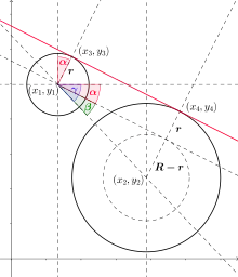 Aquí R y r indican los radios de las dos circunferencias y el ángulo se puede calcular usando trigonometría básica. Dado que , con y [4]