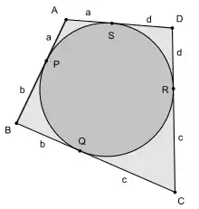 Esta conclusión se deriva de la igualdad de los segmentos tangentes de los cuatro vértices del cuadrilátero. Sean los puntos tangentes P (en el segmento AB), Q (en el segmento BC), R (en el segmento CD) y S (en el segmento DA). Los segmentos tangentes simétricos alrededor de cada punto de ABCD son iguales, por ejemplo, BP = BQ = b, CQ = CR = c, DR = DS = d, y AS = AP = a. Pero cada lado del cuadrilátero está compuesto por dos segmentos tangentes
