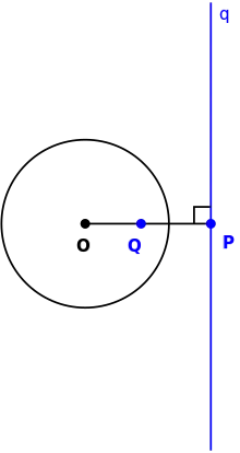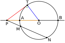No se puede dibujar una recta tangente a través de un punto dentro de un círculo, ya que dicha recta debe ser una secante. Sin embargo, se pueden dibujar dos rectas tangentes a una circunferencia desde un punto P situado fuera de la circunferencia. La figura geométrica de una circunferencia y ambas tangentes también posee una simetría de reflexión sobre el eje radial que une P al punto O, centro de la circunferencia. Por lo tanto, las longitudes de los segmentos desde P hasta los dos puntos tangentes son iguales. Según el teorema de la tangente-secante, el cuadrado de esta longitud tangente es igual a la potencia del punto P respecto a la circunferencia C. Esta potencia es igual al producto de distancias desde P a cada uno de los dos puntos de intersección de la circunferencia con una recta secante que pasa por P.