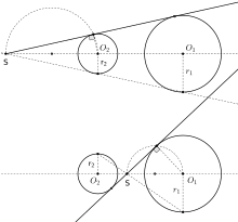 Sean O1 y O2 los centros de las dos circunferencias, C1 y C2 y sean r1 y r2 sus radios, con r1 > r 2; en otras palabras, la circunferencia C1 se define como la mayor de las dos. Se pueden usar dos métodos diferentes para construir las rectas tangentes externas e internas.