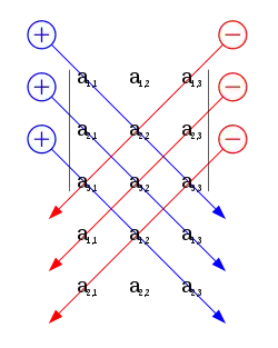 En primer lugar, repetir las dos primeras filas de la matriz debajo de la misma de manera que queden cinco filas. Después sumar los productos de las diagonales descendentes (en línea continua) y sustraer los productos de las diagonales ascendentes (en trazos). Esto resulta en:
