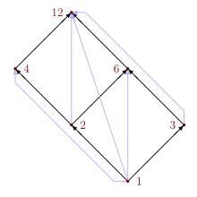 ![]() Representación de Rdiv como un diagrama de Hasse (líneas negras) y como un grafo dirigido (todas las líneas) |