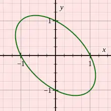 ![]() La representación de la relación Rel= {(x,y)∈ℝ×ℝ: x2+xy+y2= 1 }, cuyo gráfico 2D genera una elipse |